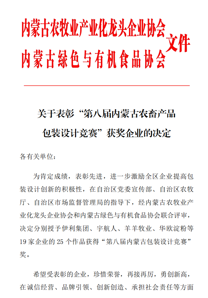關(guān)于表彰“第八屆內(nèi)蒙古農(nóng)畜產(chǎn)品包裝設計競賽”獲獎企業(yè)的決定