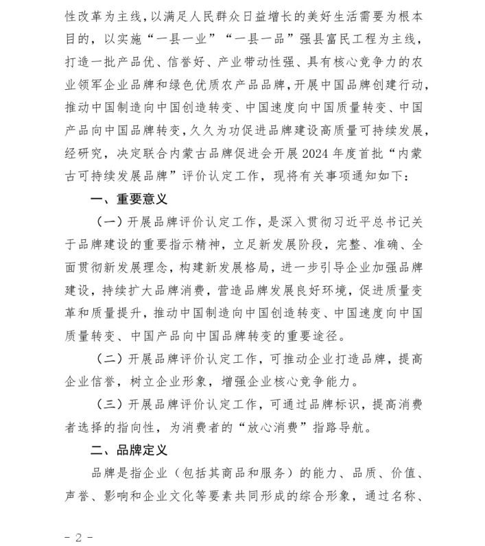 關(guān)于開展2024年度首批“內(nèi)蒙古可持續(xù) 發(fā)展品牌”評(píng)價(jià)認(rèn)定工作的通知