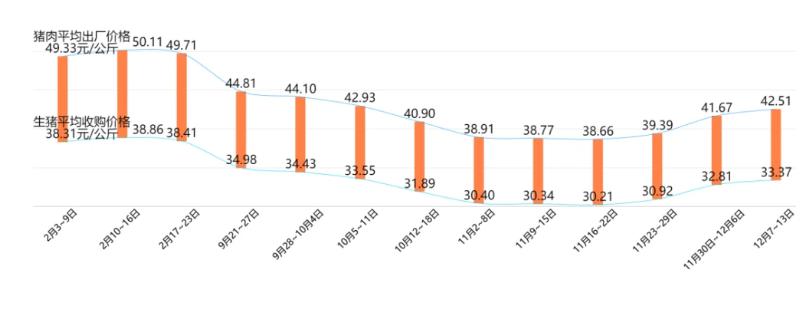 2020年中國(guó)生豬及豬肉價(jià)格走勢(shì)圖: