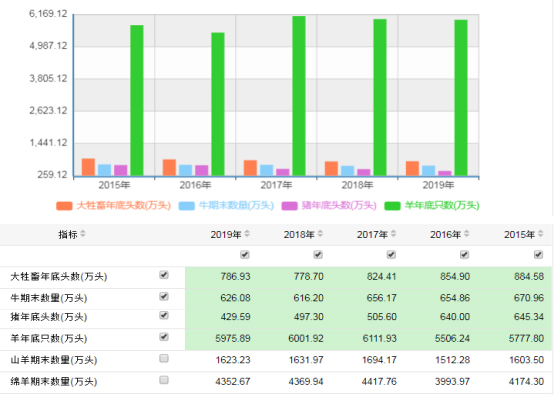全國(guó)2015-2019年牛、羊、豬期末存欄情況
