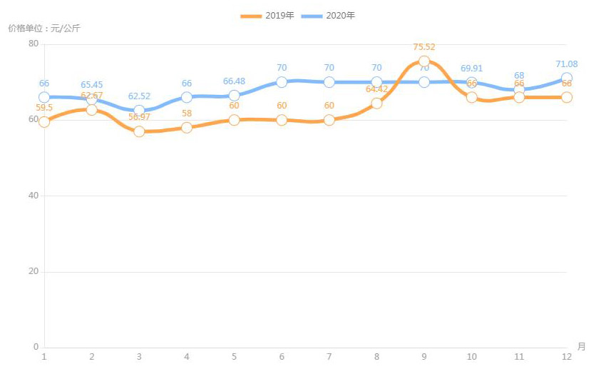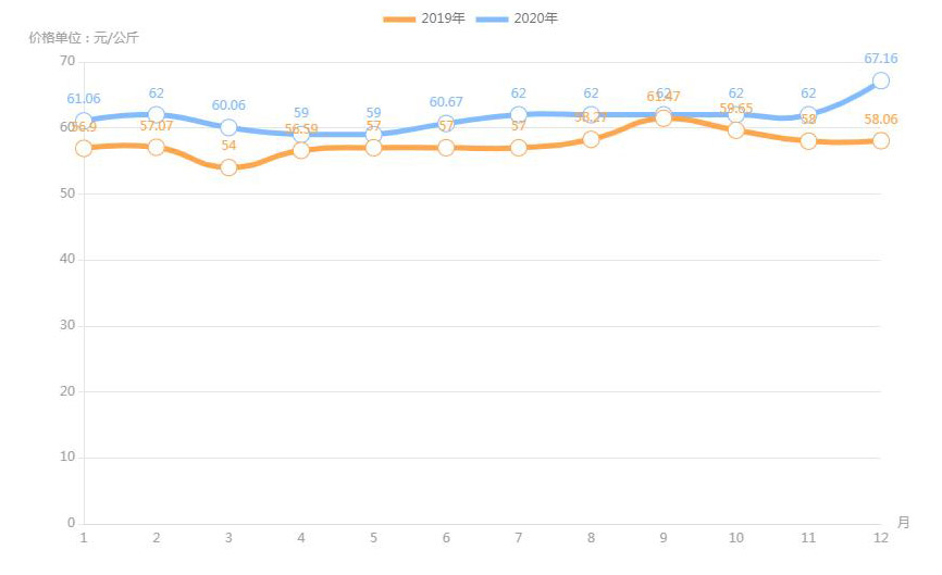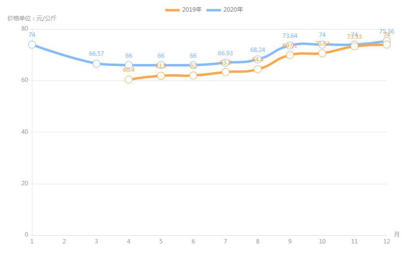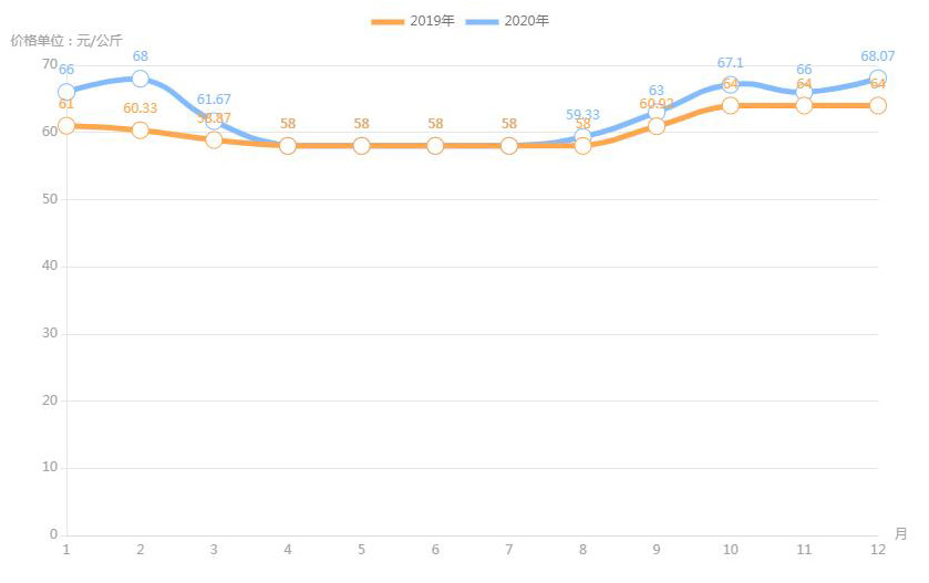 對(duì)內(nèi)蒙古幾大農(nóng)貿(mào)批發(fā)市場(chǎng)羊肉價(jià)進(jìn)行匯總分析得出:呼和浩特市內(nèi)蒙古美通農(nóng)產(chǎn)品批發(fā)市場(chǎng)羊肉最高價(jià)格出現(xiàn)在2020年11月68元/公斤,最低價(jià)格出現(xiàn)在2019年4月52元/公斤。呼和浩特市東瓦窯批發(fā)市場(chǎng)羊肉最高價(jià)格出現(xiàn)在2020年12月73.38元/公斤,最低價(jià)格出現(xiàn)在2019年5月61.08元/公斤。包頭市友誼蔬菜批發(fā)市場(chǎng)羊肉最高價(jià)格出現(xiàn)在2020年12月67.16元/公斤,最低價(jià)格出現(xiàn)在2019年3月54元/公斤。內(nèi)蒙古赤峰西城市場(chǎng)羊肉最高價(jià)格出現(xiàn)在2019年9月75.52元/公斤,最低價(jià)格出現(xiàn)在2019年3月56.97元/公斤。羊肉價(jià)格和去年同期相比整體上漲,漲幅基本在每公斤5-15元左右。